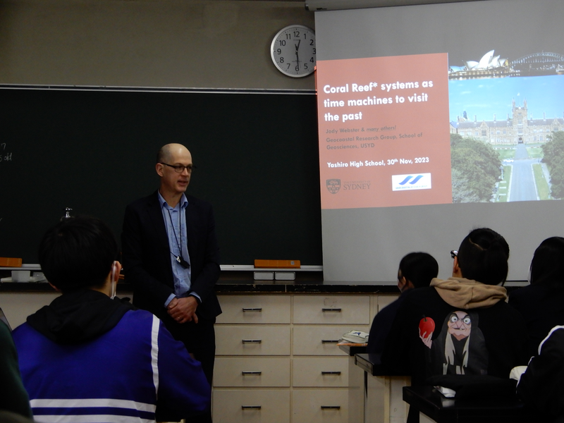 Webster先生の所属するシドニー大学理学部は、世界遺産「Great Barrier Reef」における調査研究が許されている世界唯一の機関です。Webster先生は英語で講義をされましたが、一部横山先生の研究と重なる部分のサンプルが示されている場面が印象的でした。
