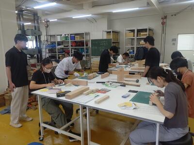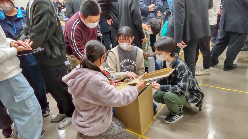 実技競技は、理科、数学、情報にかかわる実験、実習、考察など、科学技術を総合的に活用して、ものづくりの能力やコミュニケーション能力などにより課題を解決する力を競い合うものでした。そして、1チームを二つに分け、それぞれコンテストを行いました。課題は、段ボール箱・ボール紙を細工し、紙の弾性力を利用して、粘土玉を指定された目標位置に置かれたコップに入れるというものでした。弾性力をいかにうまくコントロールするかが鍵で、生徒たちは苦戦を強いられたようでした。