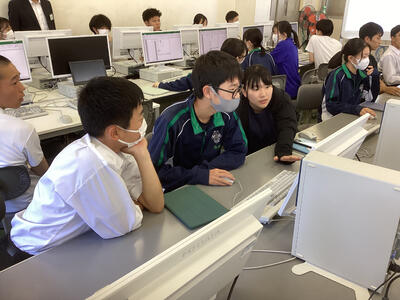 この後、理数科1年生はパソコンのエクセルを用いてSSDSE(教育用標準データセット)から箱ひげ図やヒストグラムを作成、分析する演習を行いました。膨大な数値ファイルから簡単に様々な種類のグラフを作成でき、生徒から感動の声があがりました。