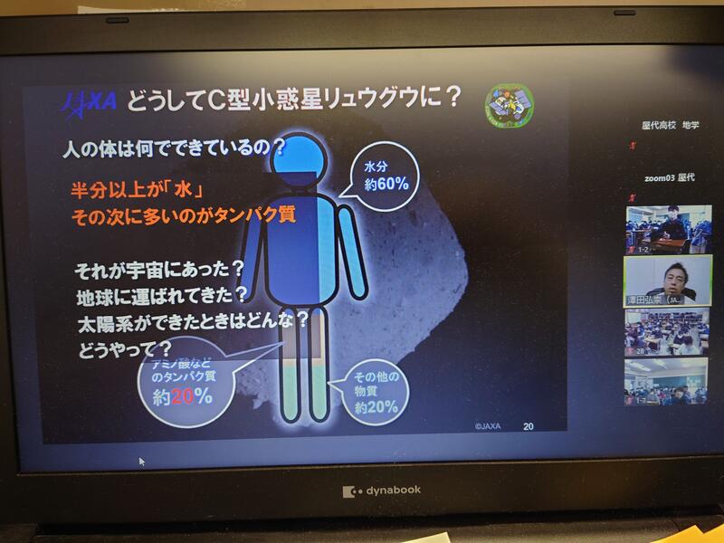 11月4日(木)に、2年理数科の「アカデミックサイエンス」として、東京大学大気海洋研究所の横山佑典教授をお招きし、気候変動に関する講義をしていただきました。毎年本校で講義をしていただき、米国海外研修でも横山先生にはお世話になっております。今年は、中学3年生が「SDGs」の取組みに力を入れていることもあり、中学3年生対象にも講義をしていだきました。ちょうど世界ではcop26(国連気候変動枠組条約第26回締約国会議)が開催されており、関心の高いお話を聴くことができました。また、今年ノーベル物理学賞に輝いた真鍋先生の話題にも触れていただき、同じ気候変動の研究でも、アプローチの仕方が違う話など、興味深い話ばかりでした。炭素循環について詳しく説明していただき、ただ単にCO2の増加を懸念するのではなく、CO2がどこから発生し、どんな作用をもたらしているCO2かを調べて対応する必要があることがわかりました。今後も気候変動について関心が高まると思いました。また、今回横山先生がここに来る前に奄美へ調査に訪れており、そこで採取した話題の「軽石」も実物を用意していただき手に取って見ることができました。確かにとても軽かったです。