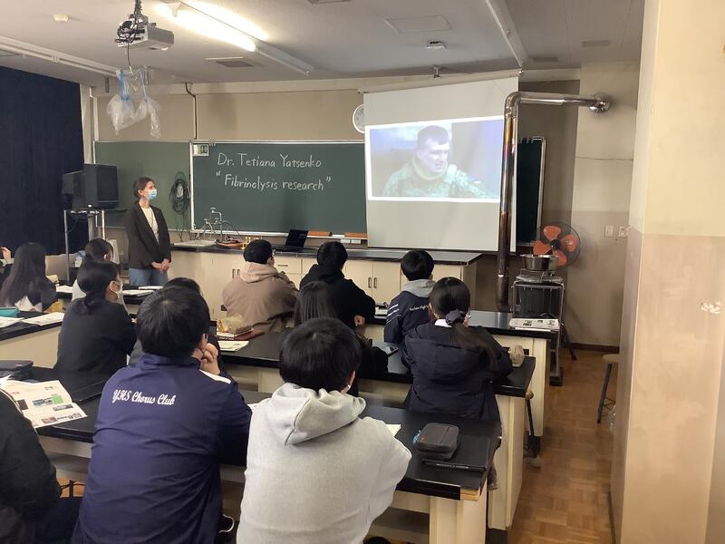 YATSENKO博士はウクライナ出身で、豊かな自然のお話の一方で現在は戦火で大変な状況である様子も伝えていただきました。科学の話の冒頭では、各テーブルにゼラチンゼリーの入ったチューブが配られ、パイナップルの一切れをそこに加える作業からはじまりました。お話を聞いているうちに、ゼリーが溶けて液体になっていました。博士の研究内容は一貫してタンパク質分解酵素に関連しており、先ほどの観察もパイナップルが出す酵素がゼラチンを分解したそうです。こうした研究が脳梗塞の予防や、ガンの転移を防ぐことにつながるというお話でした。5時間目は聞くことがメインでしたが、6時間目は生徒からの質問に講師が答え、講師からの質問に各テーブルの代表者が果敢に答えました。