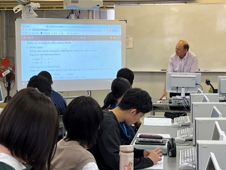 英語の聞き取りが苦手な生徒、コンピュータ操作が苦手な生徒、タイピングが苦手な生徒と様々ですが、直接アサノ先生に指導をしていただいたり、仲間同士で助け合ったりしながら、喜々として積極的に取り組んでいました。大半の生徒にとってHTMLの使用は初めての経験で、こういった実習演習は非常に興味深かったようです。自分で作成したプログラムがブログに反映されたときには、思わず歓声があがりました。