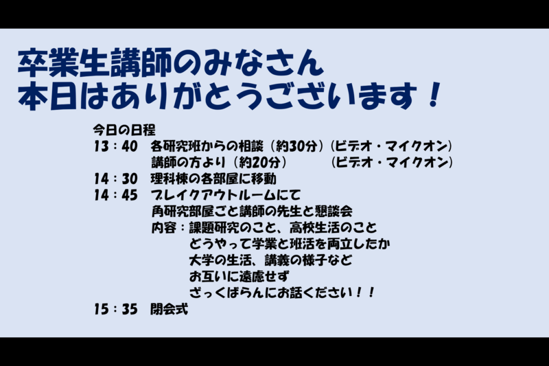 ・研究の話だけでなく、勉強のことや高校生活のことを話してくださり、ありがとうございました。とても面白かったです。