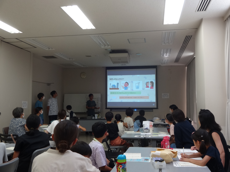 植物に含まれる色素“アントシアニン”が水溶液の性質を調べる指示薬になり、酸性やアルカリ性の強弱によって色が変化することをレモン汁や重曹、洗剤といった身近な製品を使って観察しました。アシスタントの生徒は、化学や生物の授業で学んだ知識をもとにタブレットで作成したスライドを活用して児童や保護者に分かりやすく教えてくれました。参加した小学生の皆さんには自宅でも追加実験ができるように、アントシアニン色素を染み込ませた試験紙をプレゼントし、皆さん喜んで帰っていきました。