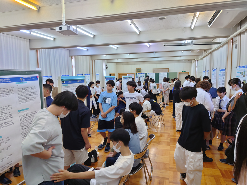 高校2年生が各会場に分かれて、課題研究・課題研究として取り組んできた探究の内容をポスターセッション形式で行いました。当日は授業公開日でしたので、一般の方(保護者の方)も多く見に来られました。県内の他の高校からも、関係の先生方が見に来られました。