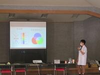 地域の健康と食、運動(農業)と健康との関わりなどを研究し、様々な産業とタイアップしながら、地域をブランディングしてきた佐久地域。その中心的な役割を担ってきた佐久総合病院での活動の様子を、映像を交えながらお話いただきました。健康維持のために、今より10分(1000歩)の身体活動を加えること、座り続けないこと、など提案していただきました。地域医療(農村医療)の活動についは、医療従事者を目指している生徒にとってとても参考となったようです。簡単なストレッチの方法なども教えていただき、とても楽しく時間を過ごすことができました。