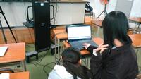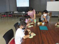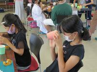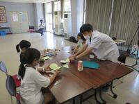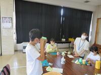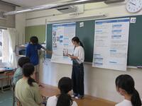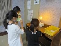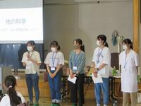 午後は、埴生公民館を会場に「夏休み子どもカレッジ」が開かれ、その中で「光の科学」をテーマに、今度は高校3年生の女子5名が先生となって、小学校高学年の児童を対象に実験を行いながら指導しました。