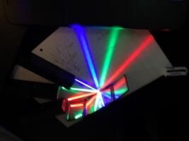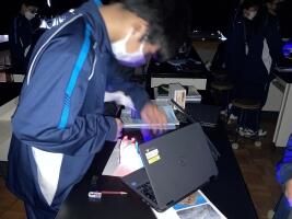 また、1年生の理科の授業では光の反射について学習していました。「ヘロンの公式」について話し合う場面で、友だちやA先生の発言に出てくる単語を調べながら話し合ったり、他教科(数学)の三角形の学習を引き出したりしながら学習を進める姿からは「ICTは文房具」になったのだなということを感じました。写真で記録に残したり、生徒のメモがクラウド上に自動更新されたりしていく様子からは改めて便利さも感じることができました。そして、理科は予想を立てた後に実験ができるから本当に楽しいようです。教室を真っ暗にして光の反射を実際に確かめる場面では「きれい」「すごい」「本当だ」と呟きがたくさん聞こえてきました。意欲的な表情、悩む表情、ワクワクした表情に満ちた授業にとても素敵な気持ちにさせてもらいました。(M先生より)