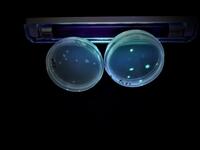 BioRad社の実験キットを用いて、オワンクラゲ由来の緑色蛍光タンパク質遺伝子(組換えプラスミド)を導入して大腸菌を「光る大腸菌」に形質転換させる実験を行いました。2日目にブラックライトを照射して、大腸菌が光る様子を確認しましたが、簡単に形質転換ができることに驚いていた様子でした。