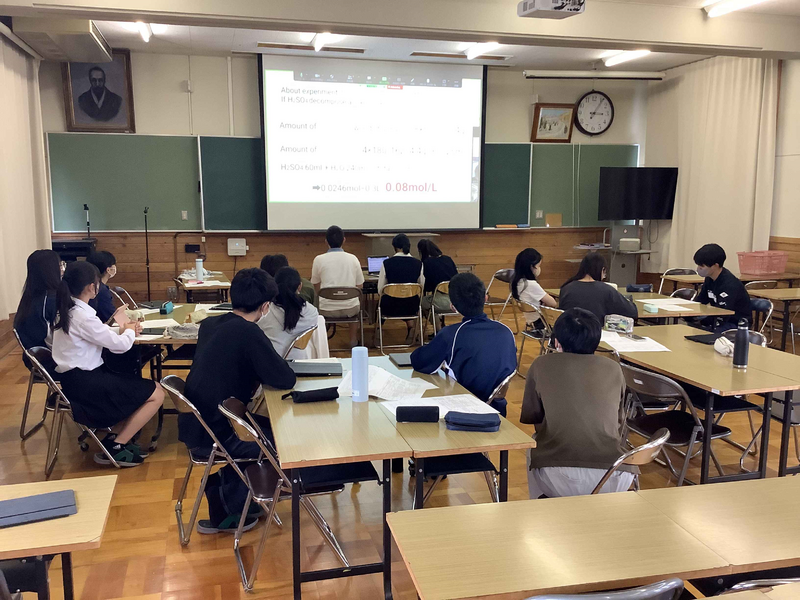 この日に先立ち、3年7組は5月9日(火)5,6限、探究の時間を利用して、課題研究の口頭発表会(10グループ)を英語で行いました。発表後に、スライドの分かりやすさ・聞き取りやすさ・熱意などを相互評価して、上位3グループをWenona校とのオンライン交流代表としました。