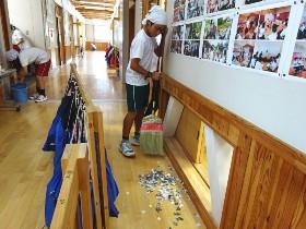 濡らした新聞紙をばらまいてほうきで掃いたり、みかんやオレンジ、じゃがいもの皮で水垢を拭いたり、新聞紙で鏡や窓を磨いたり、清掃委員から紹介された方法で清掃に取り組みました。普段とは違ったやり方で、楽しみながらも集中して清掃ができたようです。