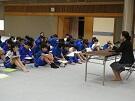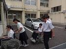 夏休みの最初には、長野県社会福祉協議会の方にお話をいただき、その後、アイマスクを着けての歩行や、車いす乗車と補助、とろみ剤を混ぜたお茶の試飲など、実際に体験してみました。