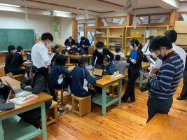 〇11月29日(火) ICTを効果的に活用した授業公開がありました。小中学校や特別支援学校、市町村の教育委員会など、約20名の方が参観されました。今回は「お互い授業を見合う」ことを目的として授業研究会まで行いました。実際やってみて先生方の意見を聞いてみると、着眼点は一人ひとり異なり、それを共有することで新たな視点を生み出せていることに気付きました。生徒のためによい授業をしようという気持ちがぐいぐい伝わってきました。生徒が主体的に取り組んでいる授業、その裏で私たち教師はどうかかわるかが本校のこれからの課題になると感じました。