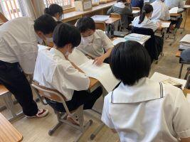 6月13日(火)本日は、社会(3年生)の授業の様子です。本時は、政治分野導入の授業で「S市の市長に誰を選ぶ?」というロールプレイングをして市民・候補者の役割に立って考えてみました。S市の人口構成や施設、市民の声などの資料をもとに、グループで各候補者の利点・問題点を表にまとめたり、その表を参考に「今なら」自分の一票をどの候補者に投票するか決めたりしました。その後、自分の選んだ候補者について選挙公報を作成し、代表者が全体に発表しました。本時は、家庭からオンラインで授業に参加している生徒も多く、グループ活動の場面では学校にいる生徒が一人、オンラインの生徒が三人など様々な形態となりました。オンラインで顔を見合わせ、相談しながら学習を進める姿からはなんだか温かいものを感じました。授業終末の代表者発表では、学校にいる生徒、オンラインの生徒、一名ずつが代表となりました。次回は、選んだ候補者ごとにグループを組んで選挙公報を練り上げます。