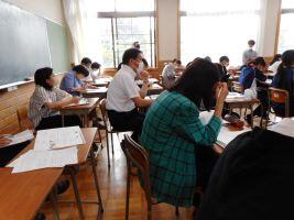 6月9日(金)屋代高校・附属中学校では、5月24日(水)から今日まで職員同士がお互いの授業を参観する「校内授業公開ウィーク」でした。本日行われた高校英語の授業では、高校の先生、中学校の先生方がT先生の授業から学びました。中高それぞれでどのような「内容」をどのような「方法」で行っているのかを知ることは、中高で連携した指導をする上でとても重要です。写真は教室後方でメモをとる先生方の様子です。授業をよりよいものにするため、私たち職員も日々勉強です。