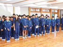 10月6日(金)新人戦は開催日が別々なので、何回かに分けて壮行会を行っています。今日は、硬式テニス、ハンドボール、柔道、剣道、体操の各班の新人戦壮行会がありました。「先生やコーチに教えてもらったことを胸に頑張る」「これからにつながる試合をしたい」「先輩と一緒につけてきた力を個人の目標に向かって発揮したい」「新しい技にたくさん挑戦したい」とそれぞれ力強く決意を述べてくれました。適度な緊張感は、本番でよい集中力とパフォーマンスを生み出すと言われます。ドキドキも味方につけて、頑張れ附中生!