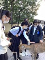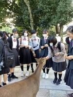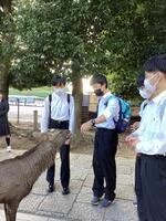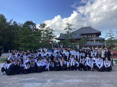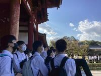 10月17日(火)晴天の奈良。3年生が奈良公園、興福寺国宝館の見学をしました。東大寺南大門では、仁王像の迫力に目を奪われ、大仏殿の見学では、現地ガイドさんから、大仏殿までの石畳は、真ん中からインド、中国、韓国、日本の石を使っていることを説明されると「仏教伝来(の順)だ!」とひらめき、感心していました。そしていよいよ大仏との対面。「大きい、、」想像していたよりも大きな大仏を見上げたまましばし沈黙。興福寺の見学では時間いっぱい何度も国宝を見に行ったり、時にはメモをとる姿もありました。歴史好きの生徒がますますその魅力に引き込まれた1日でした。