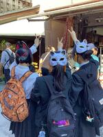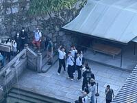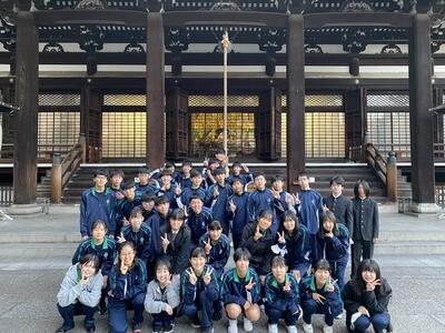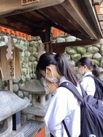 10月19日(木)3年生がクラス別で、京都市内を見学しました。A組・B組ともにスタートは伏見稲荷大社です。観光客も多く、生徒が楽しみにしていた「おもかる石」(願いを心の中で唱え、丸い石を持ち上げた時、自分が予想したより軽ければ願いが叶うという石)ができるか心配でしたが、希望者全員持ち上げることができました。待っている間「石は重い」と自己暗示をかけたものの、多くの生徒が「重かった、、、」と苦笑い。願いは自分で努力してつかまないといけなそうです。
