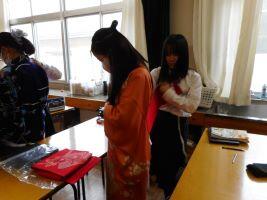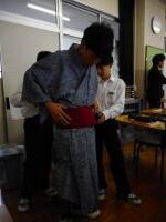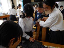 10月8日(火)附属中の家庭科は高校の先生が担当しています。今日は、1年生が家庭科の時間に着物や浴衣の着付けを教えてもらいました。生徒は着物や浴衣に合う帯を自分たちで選び、グループで協力をして着付けを行いました。「1回教えてもらっただけでは分からない」と何度も手元の動画を止めたり巻き戻したりして頑張っていました。今は、動画と言う便利なツールがあるので、学びの幅も広がりますね。