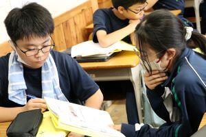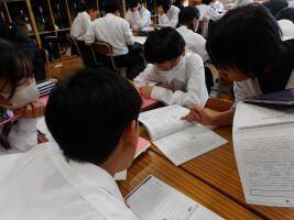 10月9日(水)1年生が国語の時間に文法の演習をしていました。動詞ひとつにしても「〇〇活用」「〇〇動詞」などさまざまな種類の文法があります。一斉授業で理解したと思った内容も、一人になって分析をしてみると分からないところに気が付きます。生徒は、「難しい」と言いながら、声に出して自分の理解を確かめたり、友達に教えてもらったり、また教えてもらったことを別の友達に教えたり、一人で黙々と取り組んだり、とそれぞれの方法、それぞれのペースで学習を進めていました。