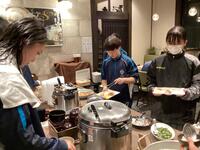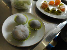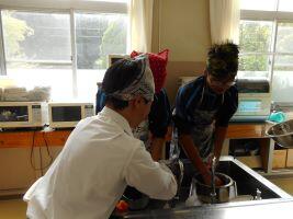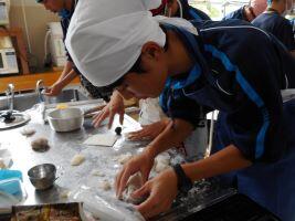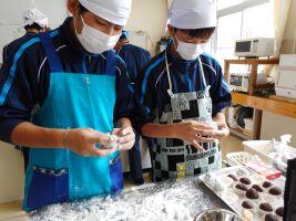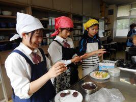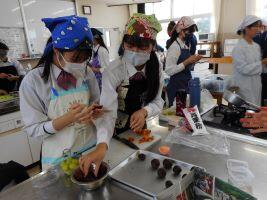 10月15日(火)3年生が家庭科でフルーツ大福を作りました。ミカンやブドウ、柿などのフルーツの他に、クリームチーズ、チョコレート、ホイップクリーム、さつまいもペーストなど、それぞれが大福に入れたいものを持ってきて、思い思いの大福を作りました。中には、求肥(ぎゅうひ)にココアパウダーを混ぜて、ココア味の大福を作っている班もあり、皆楽しそうに調理実習をしていました。感心したのは手際のよさです。家庭科のN先生が「みんな手際よく進められるから、1時間でできる」と言っていた通り、大福を作りながら、食器や道具を洗い、班の人皆で協力をして実習から片付けまで終わりました。