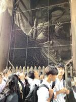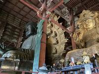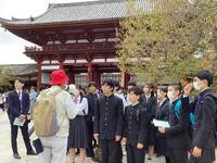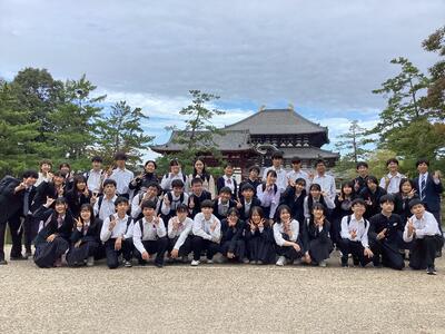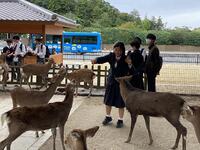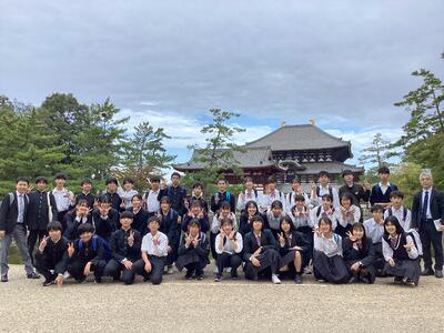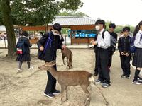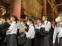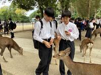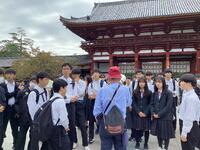 10月24日(木)今日は奈良県に移動し、東大寺と興福寺国宝館の見学をしました。奈良公園周辺は、海外からの観光客の方々がたくさんおり、様々な言語が飛び交っていました。生徒達は、そんな中でも、興福寺では、自分の興味のあるものはじっくりと解説を読み、時には戻って確認をする姿がありました。奈良公園は地元のボランティアガイドの方々に案内をして頂きました。「奈良は初めて訪れた」と言う生徒もたくさんおり、ヒノキで彫られた日本最大の木彫像の金剛力士像、世界最大級の木造建造物の大仏殿、高さ15mもある、盧舎那仏(奈良の大仏)を見上げて「ほーっ!」と驚きの声をあげていました。奈良公園ではたくさんの鹿にも迎えられ、初めての鹿せんべいを恐る恐る鹿にあげる生徒、怖くて逃げる生徒、自分も味見をする生徒、と思い思いに楽しみました。