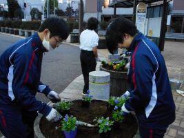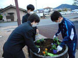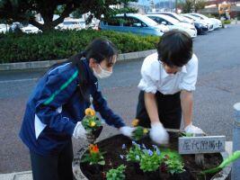 10月31日(木)環境委員会が、中庭と屋代駅前の花壇の花の植え替えをしました。今日の放課後、委員会の時間に植えきれなかったパンジーとビオラを環境委員会の有志が植えにいきました。生徒は、色合いや配置を考えながら手際よく作業をしていました。日が落ちる前にと、急いで作業をしていると、通りかかった屋代高校の生徒が2名「電車の時間があるから」と手伝ってくれました。寒い日でしたが、心があたたまりました。