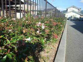 〇10月14日(木) 附属中学校の昇降口北側のフェンス越しに植え込みがあります。白い小さな花が咲いていつこの樹木、アベリアと言います。6月から10月まで長い期間花が咲くそうです。このアベリア、元々屋代高校の西門周辺にあったものを、附属中ができたときに、現在の位置に移植したそうです(同窓会長の赤地先生からお聞きしました)。調べてみると、花言葉は謙遜、強運。花を見ると、花言葉の意味が分かる気がします。今年は例年より気温が高いため、まだまだいっぱい咲いていますが、まもなく気温が下がります。今のうちに花をみて、”強運”を手に入れようと思っています。運を味方につけないと、自分の力はまだまだ足りませんので…(謙遜)。