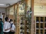 ↓昇降口に飾られた竹に短冊を付ける生徒