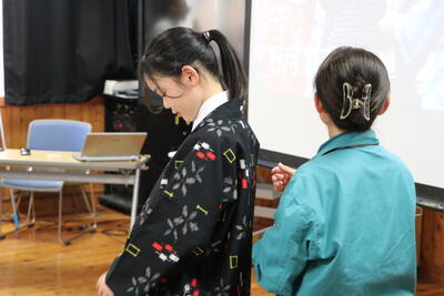 世界無形文化遺産である日本の食べごと文化について、「家族や地域を結ぶ社会性」や「風土が育む多様な地域性」などの観点から講義を受けた後、会の方の寸劇を通して、きずなを感じ感謝を表す場面について具体的に学びました。そして、上座や下座などからもてなしの気持ちを、一汁三菜の配置からその意味などを習い、実際に準備していただいた伝統的な料理を食べることで、漬け物の濃い味付けの理由などを体験を通して学ぶことができました。このように地域の方に教えていただける機会を大切にしていきたいです。