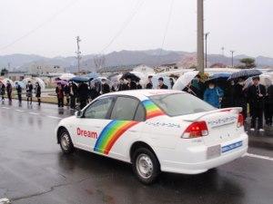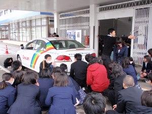 ドリームモータスクールに訪問させていただき、雨の降る中での急ブレーキの緩さをみさせていただいたり、車から見えなくなる位置などをみんなで確認するなど、交通事故防止に向けてあらゆることを学ばせていただきました。