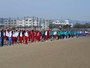 今日は、とても暖かい気候となり、正面玄関前では、しっかりと準備体操をした後、元気よく校門を出発する1年生の生徒のみなさんたちの様子がみられました。