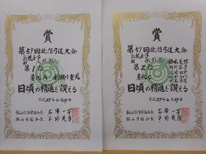 第59回北信弓道大会高校女子の部において、本校高校の利根川聖花さんが個人優勝を果たし、屋代Cチーム(鈴木美緒さん、駒村直子さん、嶋崎由奈さん、仁科あかりさん、中島冬萌さん)が団体第2位の成績を修めました。