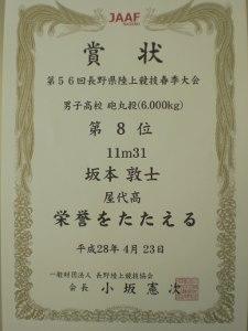 4月23日に行われました「長野県陸上競技春季大会 男子高校砲丸投げ」において、2年生の坂本敦士君が、11m31㎝の記録で8位に入賞しました。