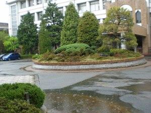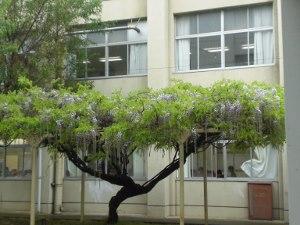 中庭には藤の花が雨の中美しく咲き、その向こうでは生徒諸君が授業に集中していました。