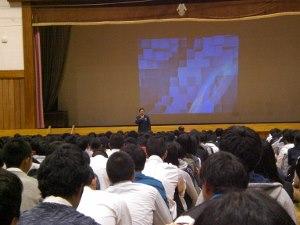 ご出身のルーマニアから日本への留学を決意されたいきさつから、現在のご研究について、そしてこれからの有機化学の方向性まで、「夢」を中心に据えたお話をしていただきました。質疑では生徒の、間近へいって質問を聞いたうえで、多くの生徒の質問に丁寧に答えてくださいました。