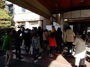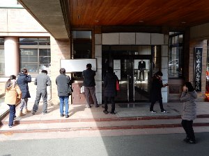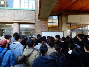 正門前から受検生たちが並び、受付開始を待っていました。寒さもそれほどではなく、受検生はコートを着ていませんでした。