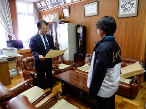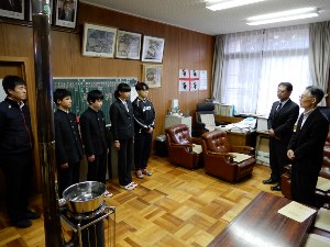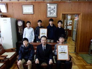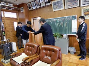 標記大会で女子団体戦で優勝を学校長に報告しました。