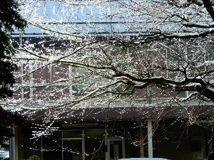 昨晩からの、みぞれ~雪によって校舎前の樹木の枝についた氷が溶けて、きらきらと輝いていました。