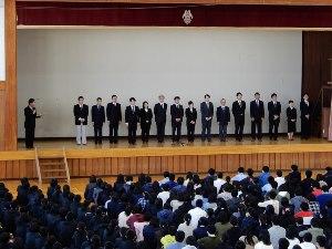 午後生徒会が対面式、班紹介を行いました。対面式では生徒会長の歓迎、鳩祭の紹介のあと、応援団による応援、そして高校・附属中学それぞれの新入生代表の挨拶と続きました。