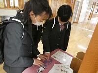 ↓はみ出した接着剤を丁寧にふき取っている生徒
