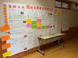 10周年記念式典の準備が着々と整ってきています。生徒会誌委員会が、講義室の廊下の壁に「生徒会誌開校10周年記念特大号」を作ってくれました。付箋を貼って生の声を綴ってある部分もあって、当日まで変化が楽しめそうです。そして、書道班のみなさんには、入口の立て看板と式次第を用意してもらっています。立て看板を今日は見せてもらいましたが、見た瞬間、うれしくなりました。こんなにも一生懸命に気持ちをこめて書かれたものを飾ることができるなんて…。ありがとう。あと少し。成功させよう。みんなで。