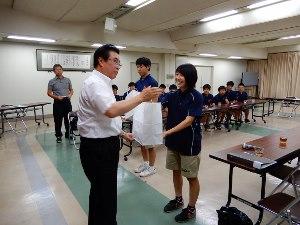 写真上は激励品を頂戴している場面です。