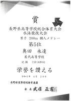奥田永遠(2年1組) 男子50m平泳ぎ:第6位、男子100m平泳ぎ: 第2位、男子200m平泳ぎ、 第2位