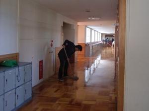 右の写真は、整備委員のみなさんが最後に廊下のワックスがけを一生懸命にしてくれている様子です。