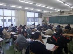 受験を目前に控えた3年生の生徒のみなさんには、資料に真剣に目を通す姿がみられたとともに、先生のお話を一言も聞き漏らさないという気迫が感じられました。