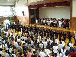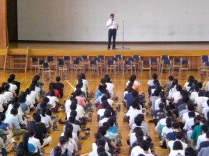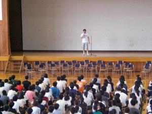 係からの夏休みの注意のあと、1年間の留学を終え帰国するジュセッペ君にお別れの挨拶をしてもらいました。日本語で流暢に思い出を語りながら、「我慢」することを学んだという言葉に、屋代高校の生活にすっかり溶け込んでいただけに、思わずうなづいてしましました。