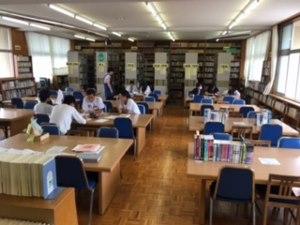 高校2年生は課題研究・課題探究の研究期間でもあります。理科室では写真上のように研究に余念がありません。また、写真下のように、図書館を利用しての調査もあります。