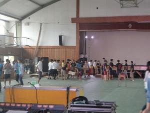 体育館では、音響設備の設置やステージの作成などが行われ、とても重い教壇や机、イスなどが力のある生徒たちにより次々と運ばれ、みるみるうちにステージができあがっていきました。