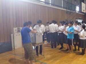 演説の後は、模擬投票に移行し、係員役の生徒から実際の選挙と同じように投票用紙が発行されて、次々と投票がされていきました。